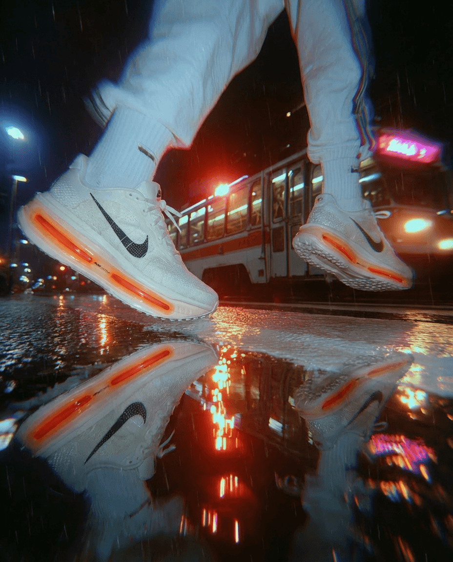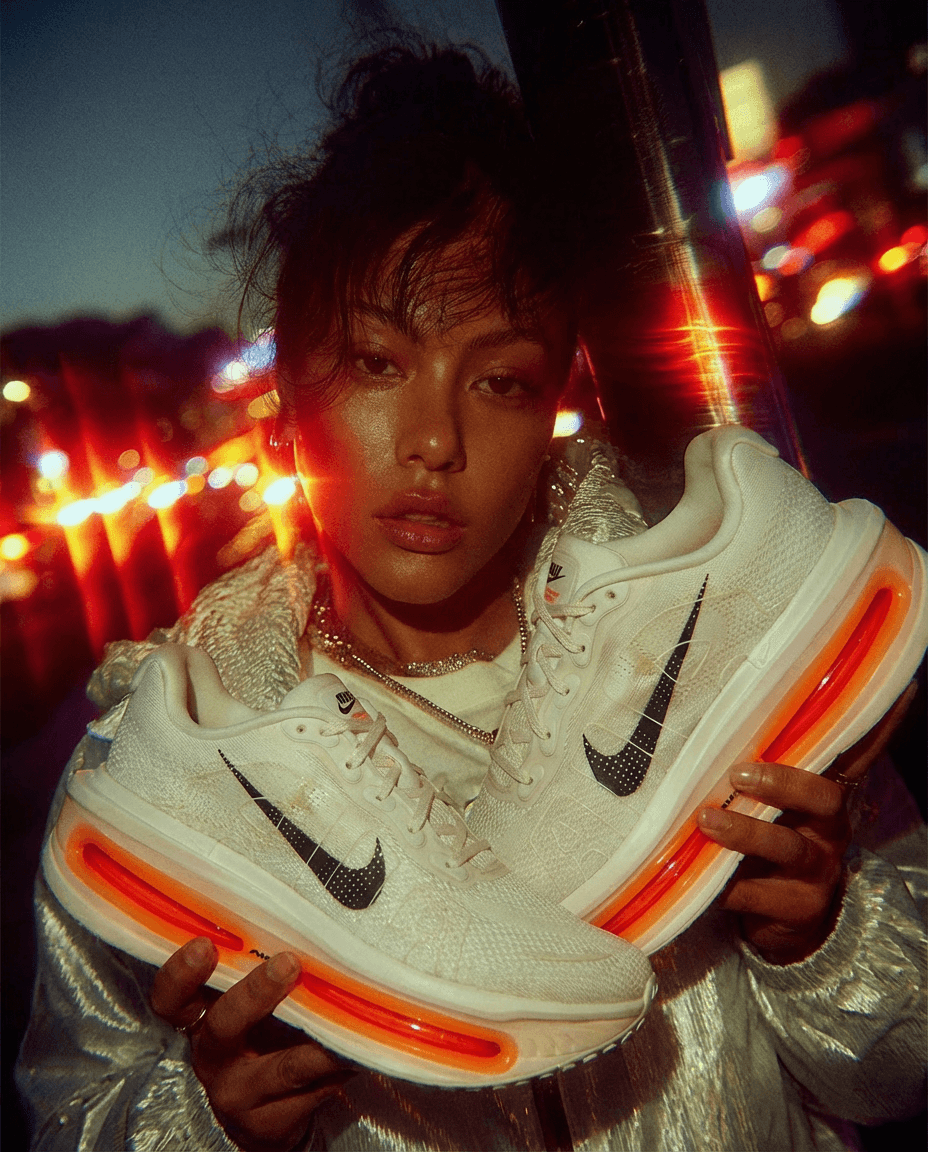 I developed an immersive art direction around a Nike sneaker, fully conceived and produced using AI, with precise attention to the product’s design, volumes, and technical details.The visual approach draws from a nocturnal urban streetwear aesthetic, driven by saturated neons, strong light sources, and dynamic reflections.The goal was to showcase the sneaker in a bold, modern environment, merging urban culture, sport, and contemporary AI-driven creation.