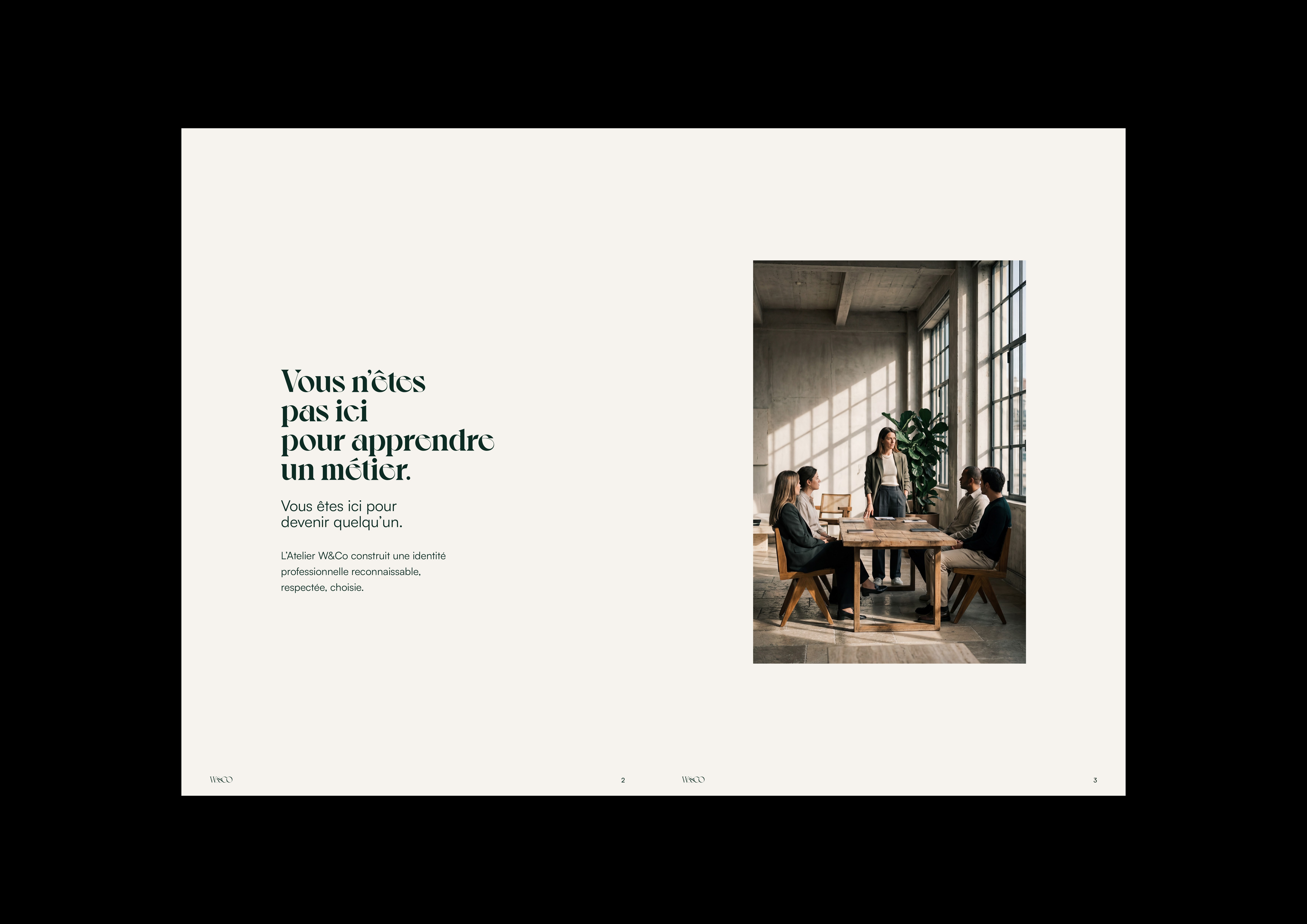 W&Co is a high-end real estate agency built around the positioning of a true house of standards.Beyond its core real estate activity, the project includes the creation of a dedicated training program for agents, designed as a natural extension of this level of excellence.The work focused on crafting a global art direction: visual identity, editorial line, photo and video shoots, definition of dress codes and attitudes, as well as the production of premium assets — from the training book to advertising campaigns.Each element was designed to express a consistent posture: credibility, mastery, and quiet elegance.W&Co stands as a real estate brand structured by a strong, coherent, and long-term vision.